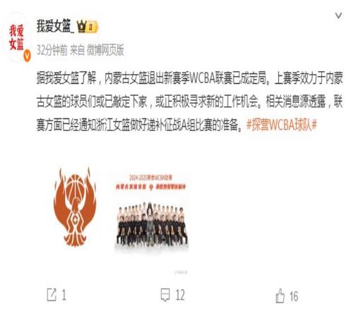 如今根據媒體人“我愛(ài)女籃”報道:“內蒙古女籃退出新賽季W(wǎng)CBA聯(lián)賽已成定局。上賽季效力于內蒙古女籃的球員們或已敲定下家,或正積極尋求新的工作機會(huì )。相關(guān)消息源透露,聯(lián)賽方面已經(jīng)通知浙江女籃,做好遞補征戰A組比賽的準備?!?/p>