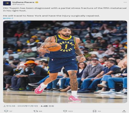 北京時(shí)間11月1日,NBA杯(季中賽)小組賽正式開(kāi)打:老鷹128-108大勝步行者。本賽季至今,步行者0勝5負和籃網(wǎng)并列東部倒數第一。屋漏偏逢連夜雨,步行者官方今日宣布:奧比-托平被診斷出右腳第五跖骨部分應力性骨折。
