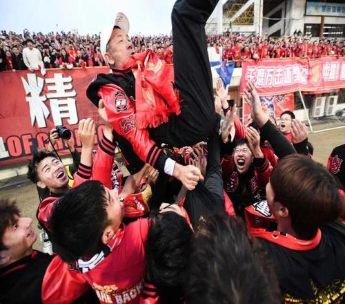 與之形成對比的,是隊內的“老足球人”。吳慶成為領(lǐng)隊的第一年,他經(jīng)歷過(guò)兩江競技解散的悲劇,那天他一個(gè)人背著(zhù)包離開(kāi)俱樂(lè )部的背影,是他留給深?lèi)?ài)的職業(yè)足球最難過(guò)的畫(huà)面。上賽季,吳慶臨危受命出任代理教練,又經(jīng)歷了沖超失敗的苦澀。在年輕人瘋狂慶祝的瞬間,他眼里閃著(zhù)淚花,沒(méi)有太多的言語(yǔ)表達,只是默默地看著(zhù)身邊的弟弟們,甚至是孩子們,銅梁龍之于他,已經(jīng)超出了“陣地”的意義,更有他足球生命的延續。