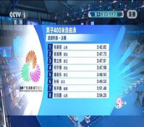 湖北選手徐海博獲得亞軍,浙江選手費立緯排名第三。潘展樂(lè )以3分48秒93位列第五。另一位浙江名將孫楊以3分49秒53名列第六。