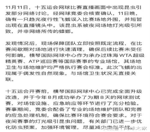 在事件發(fā)生24小時(shí)后,全運會(huì )網(wǎng)球競賽委員會(huì )于9月13日晚間正式發(fā)布情況說(shuō)明。這份通過(guò)官方渠道發(fā)布的聲明顯示:“經(jīng)網(wǎng)球競委會(huì )核查確認,12日晚,確有一只趨光夜行性飛蛾誤入比賽場(chǎng)地外圍,該昆蟲(chóng)在場(chǎng)地內短暫停留后即飛離,并未對比賽造成實(shí)際影響?!?/p>