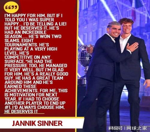 “如果讓我選另一個(gè)球員最終排名第一,我永遠都會(huì )選他,他配得上這個(gè)榮譽(yù)?!毙良{的言下之意是,阿爾卡拉斯在自己心目中是無(wú)可替代的年終世界第一。不過(guò),他同時(shí)也強調,雖然今年在意大利家門(mén)口失去了這項年終榮譽(yù),但是他早已經(jīng)將此當成明年奮斗的動(dòng)力,已經(jīng)做好了怎么失去就怎么拿回來(lái)了的準備。