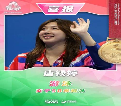 第十五屆全國運動(dòng)會(huì )女子50米蛙泳決賽中,上海運動(dòng)員唐錢(qián)婷以30秒00的成績(jì)奪得金牌。