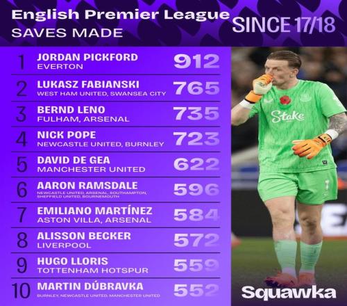 北京時(shí)間11月19日,知名數據機構Squawka統計出了英超自2017-18賽季以來(lái)門(mén)將撲救次數的排行榜,埃弗頓的皮克福德以912次撲救排名第一,法比安斯基765次第二,萊諾735次第三。